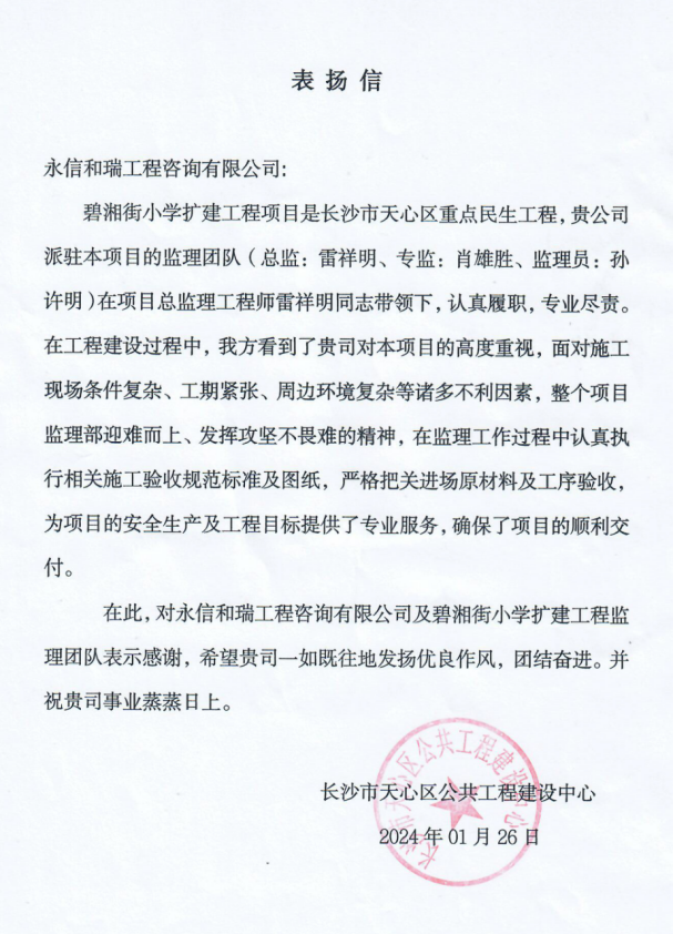 長沙市天心區公共工程建設中心表示,感謝永信和瑞及其監理團隊對碧湘街小學擴建工程的辛勤工作和專業貢獻,并鼓勵公司繼續發揚團結奮進的優良作風,共同為社會和民生事業作出更大的貢獻。